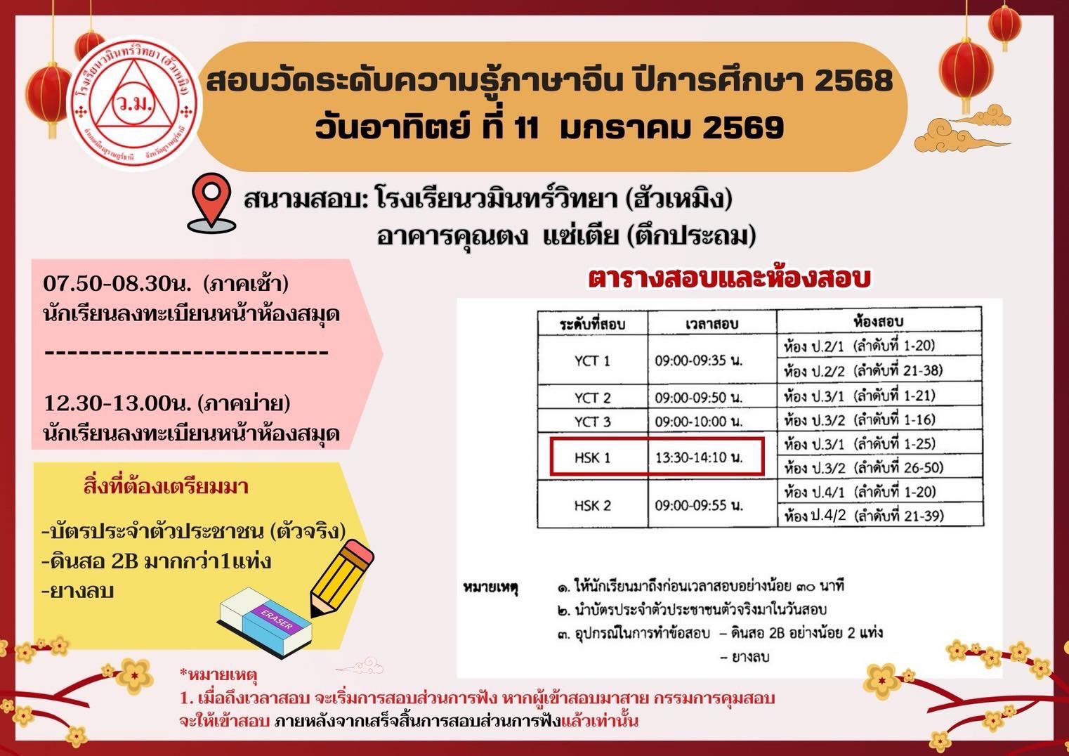 สอบวัดความรู้ภาษาจีน ปีการศึกษา 2568 วันอาทิตย์ ที่ 11 มกราคม 2569 สนามสอบ : อาคารคุณตง แซ่เตีย โรงเรียนวมินทร์วิทยา (ฮัวเหมิง)