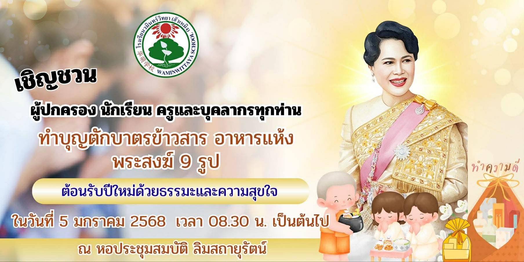 วันที่ 5 ม.ค. 68 เวลา 08:30 น. เป็นต้นไป #เชิญชวน ผู้ปกครอง นักเรียน ครูและบุคลากรทุกท่าน ทำบุญตักบาตร ข้าวสารอาหารแห้ง พระสงฆ์ จำนวน 9 รูป ณ หอประชุมสมบัติ ลิมสถายุรัตน์ โรงเรียนวมินทร์วิทยา (ฮัวเหมิง) #ต้อนรับปีใหม่ด้วยธรรมะและความสุขใจ #สวัสดีปีใหม่256
