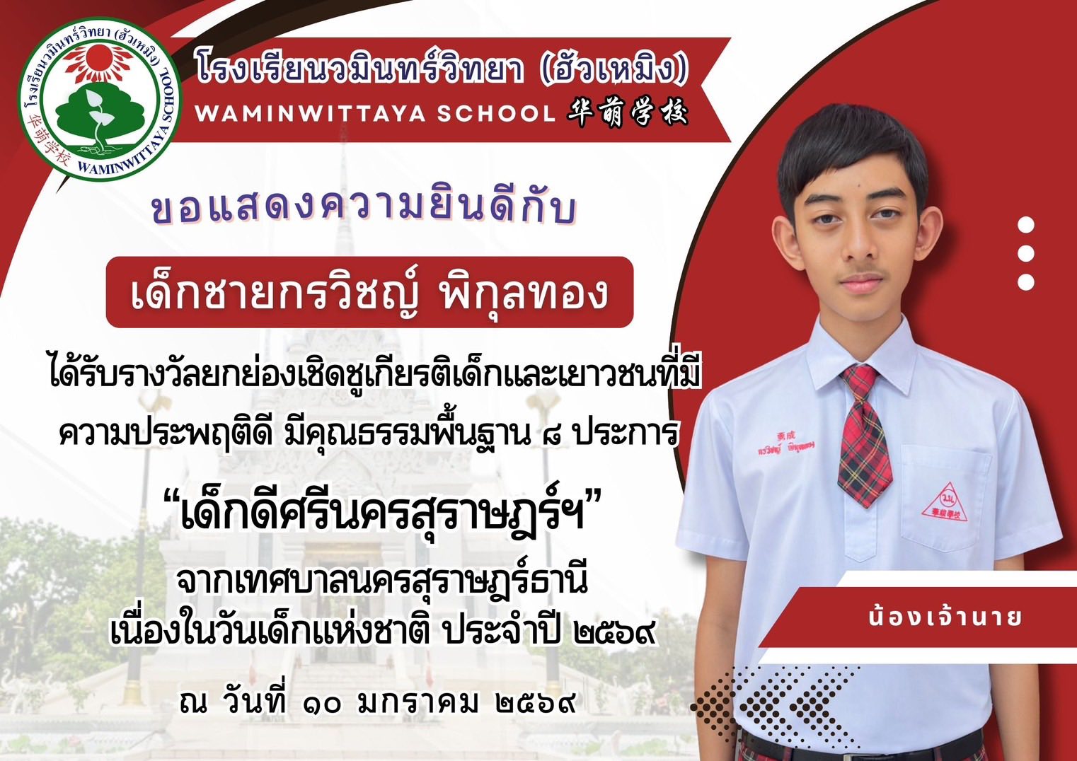 โรงเรียนวมินทร์วิทยา (ฮัวเหมิง) ขอแสดงความยินดีกับ เด็กชายกรวิชญ์ พิกุลทอง นักเรียนชั้นประถมศึกษาปีที่ 6/2 ที่ได้รับรางวัลยกย่องเชิดชูเกียรติ "เด็กดีศรีเมืองสุราษฎร์" เนื่องในโอกาสวันเด็กแห่งชาติ ประจำปี ๒๕๖๙
