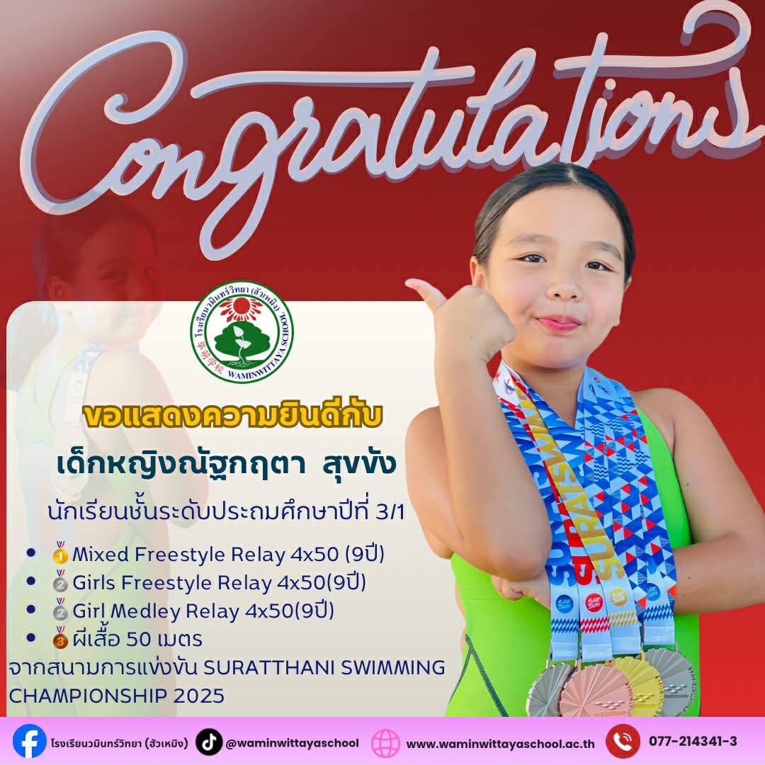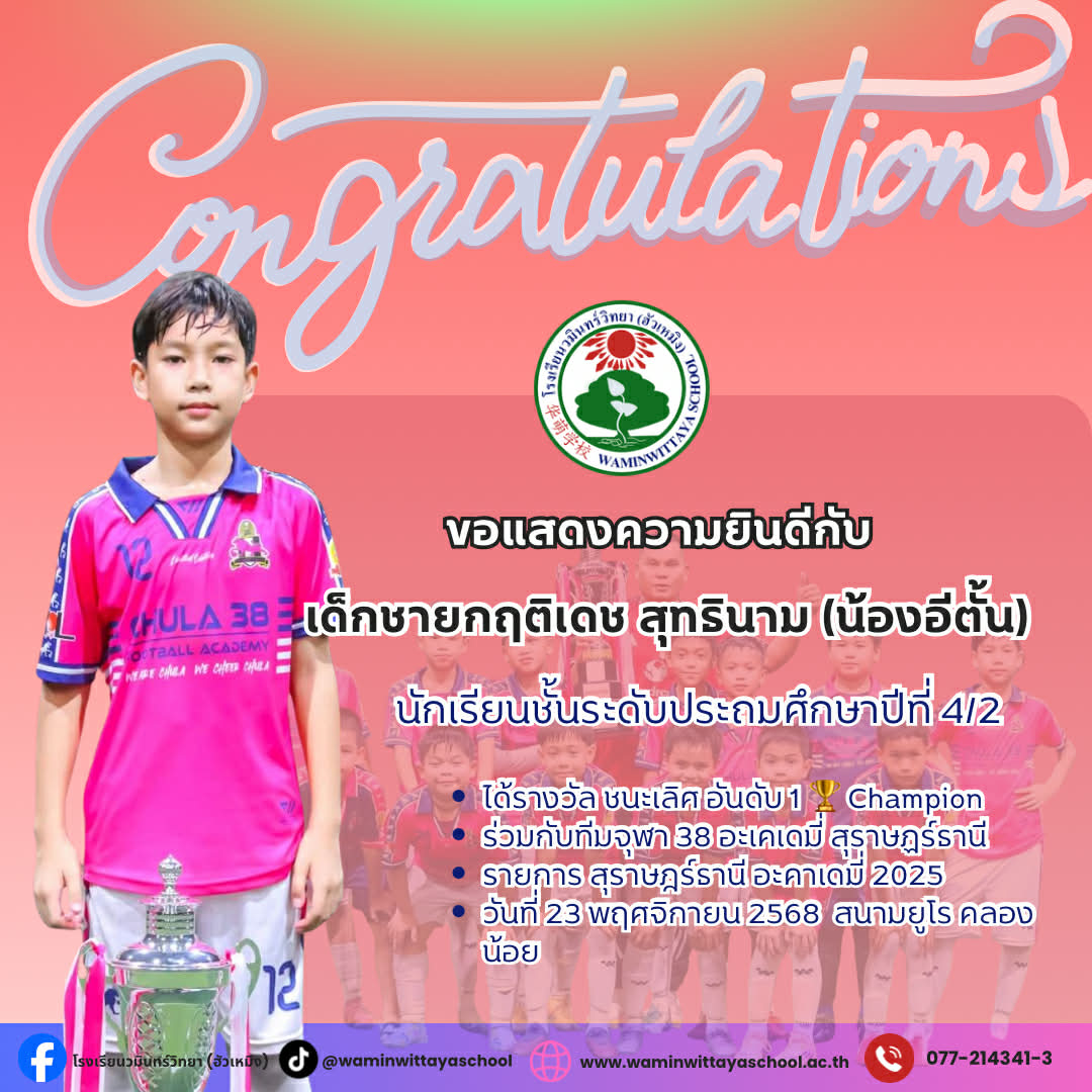 ขอแสดงความยินดีกับ เด็กชายโคดา ซูเบญ เศวตเวช นักเรียนที่ได้รางวัล เหรียญทอง อันดับ 1 ระดับจังหวัด การแข่งขันเล่านิทานภาษาอังกฤษ (Story Telling) เป็นตัวแทน เขต 1 สุราษฎร์ธานี ในการแข่งขันทักษะวิชาการนักเรียนวันเอกชนภาคใต้ ครั้งที่ 10 ประจำปี 2569 จังหวัดระ