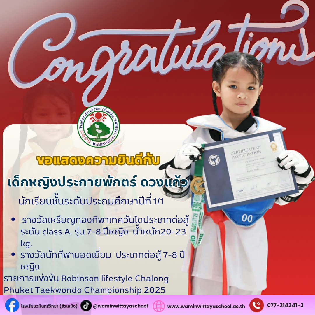 ขอแสดงความยินดีกับนักเรียนโรงเรียนวมินทร์วิทยา (ฮัวเหมิง) ที่คว้าเหรียญทอง ในการแข่งขันเทควันโด้
