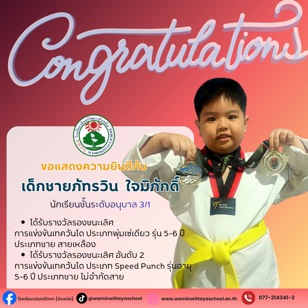 ขอแสดงความยินดีกับ เด็กชายภัทรวิน ใจมิภักดิ์ นักเรียนชั้นระดับอนุบาล 3/1 ได้รางวัลรองชนะเลิศ - การแข่งขันเทควันโด ประเภทพุ่มเซ่เดียว รุ่น 5-6 ปี ประเภทชาย สายเหลือง - ได้รับรางวัลรองชนะเลิศอันดับ 2 การแข่งขันเทควันโดประเภท Speed Punch รุ่นอายุ 5-6 ปี ประ