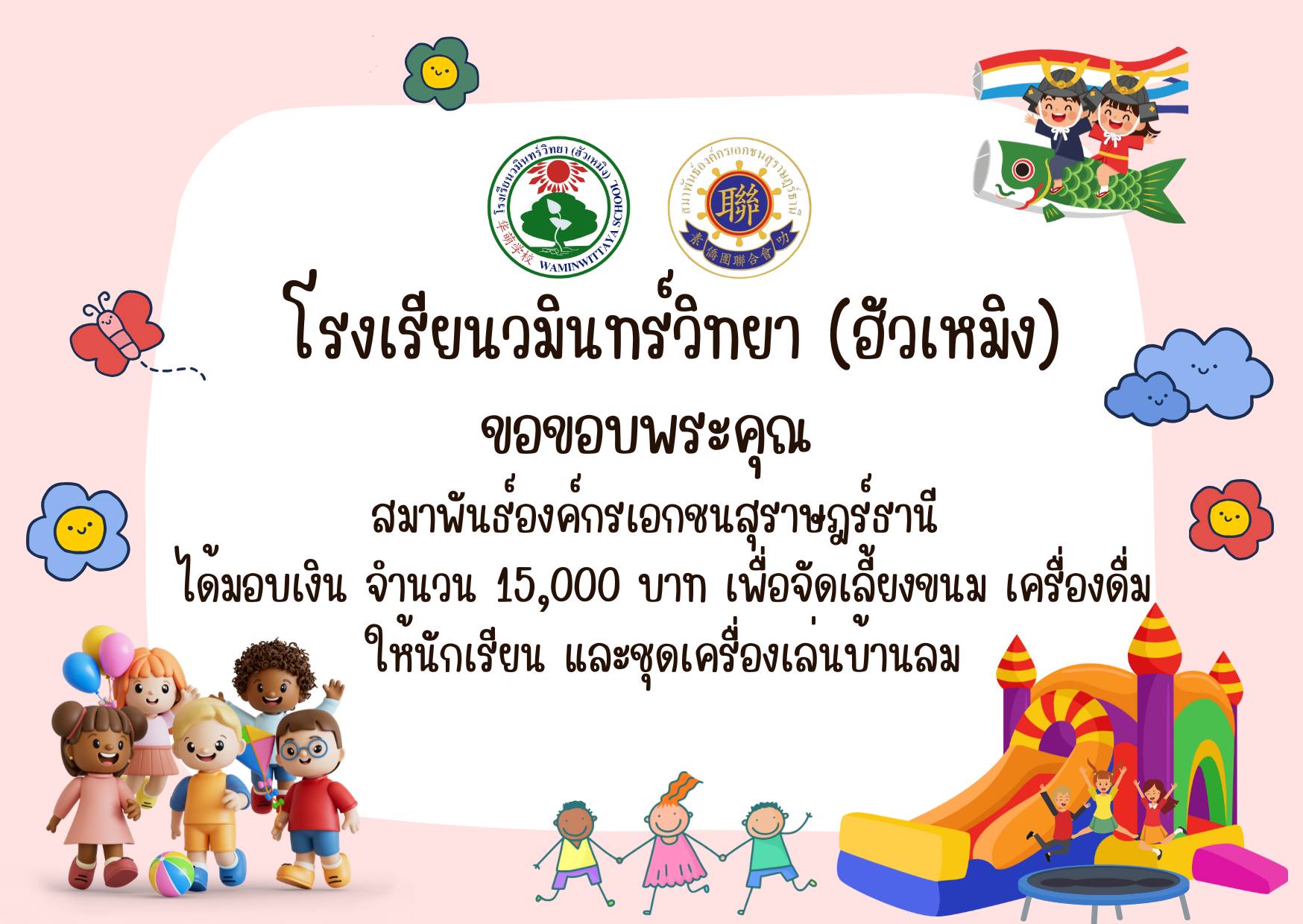 โรงเรียนวมินทร์วิทยา (ฮัวเหมิง) ขอขอบพระคุณ สมาพันธ์องค์กรเอกชนสุราษฎร์ธานี 素叻府侨团联合会 ได้มอบเงิน จำนวน 15,000 บาท เพื่อจัดเลี้ยงขนม เครื่องดื่มให้นักเรียน และชุดเครื่องเล่นบ้านลม