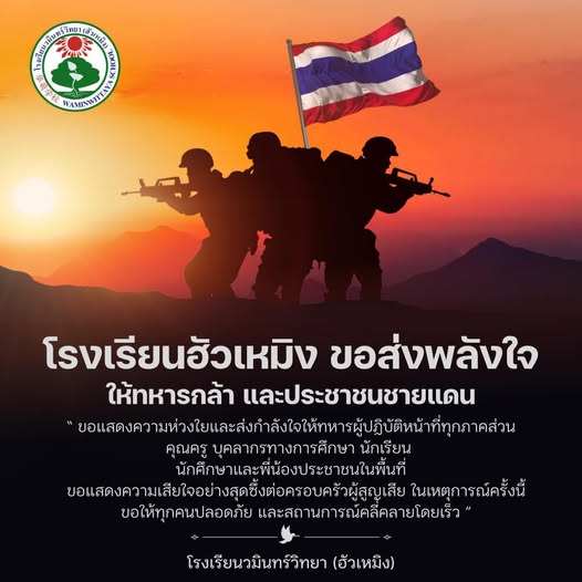 โรงเรียนวมินทร์วิทยา (ฮัวเหมิง) ขอเป็นกำลังใจแด่ทหารผู้กล้า ข้าราชการ ครู บุคลากรทางการศึกษา นักเรียน นักศึกษา และพี่น้องประชาชน ในพื้นที่ชายแดนไทย-กัมพูชา