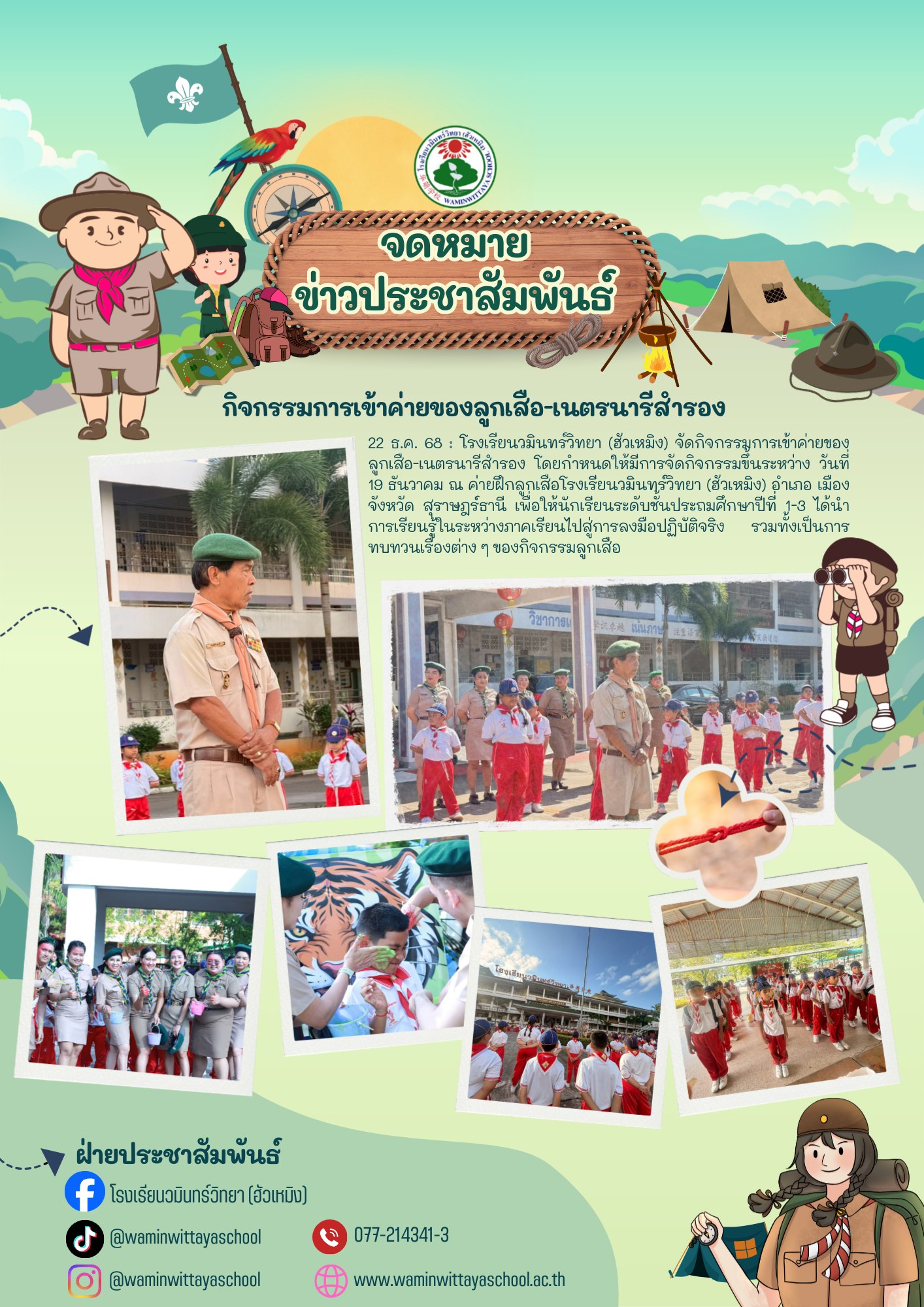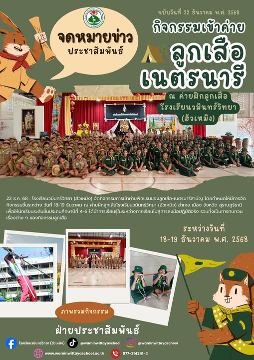 22 ธ.ค. 68 : โรงเรียนวมินทร์วิทยา (ฮัวเหมิง) จัดกิจกรรมการเข้าค่ายของลูกเสือ-เนตรนารีสำรอง โดยกำหนดให้มีการจัดกิจกรรมขึ้นระหว่าง วันที่ 19 ธันวาคม ณ ค่ายฝึกลูกเสือโรงเรียนวมินทร์วิทยา (ฮัวเหมิง) อำเภอ เมือง จังหวัด สุราษฎร์ธานี เพื่อให้นักเรียนระดับชั้นปร