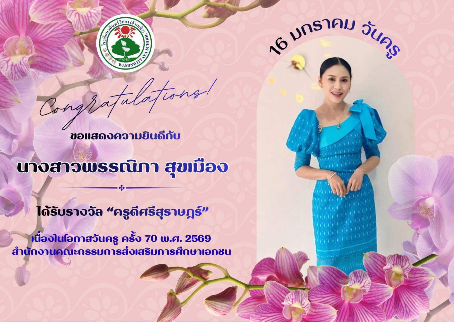 โรงเรียนวมินทร์วิทยา (ฮัวเหมิง) ขอแสดงความยินดีกับ นางสาวพรรณิภา สุขเมือง (ครูแยม) ได้รับรางวัล ”ครูดีศรีสุราษฎร์“ เนื่องในโอกาสวันครูครั้งที่ 70 พ.ศ. 2569 สำนักงานคณะกรรมการส่งเสริมการศึกษาเอกชน