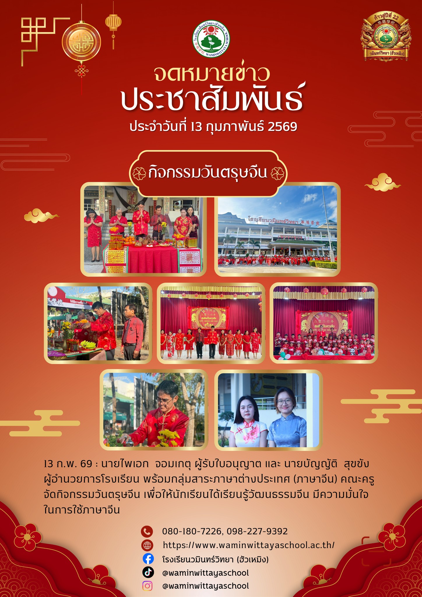 13 ก.พ. 69 : นายไพเอก จอมเกตุ ผู้รับใบอนุญาต และ นายบัญญัติ สุขขัง ผู้อำนวยการโรงเรียน พร้อมกลุ่มสาระภาษาต่างประเทศ (ภาษาจีน) คณะครู จัดกิจกรรมวันตรุษจีน เพื่อให้นักเรียนได้เรียนรู้วัฒนธรรมจีน มีความมั่นใจในการใช้ภาษาจีน