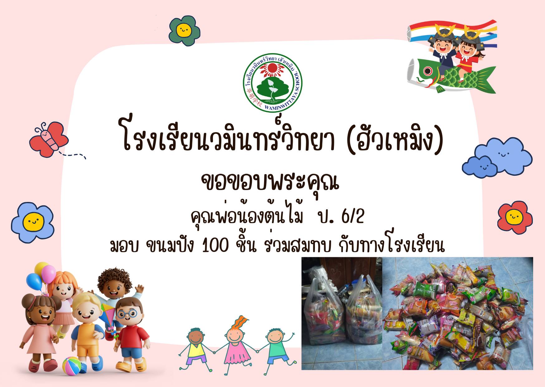 โรงเรียนวมินทร์วิทยา (ฮัวเหมิง) ขอขอบพระคุณ คุณพ่อน้องต้นไม้ ป. 6/2 มอบ ขนมปัง 100 ชิ้น ร่วมสมทบ กับทางโรงเรียน