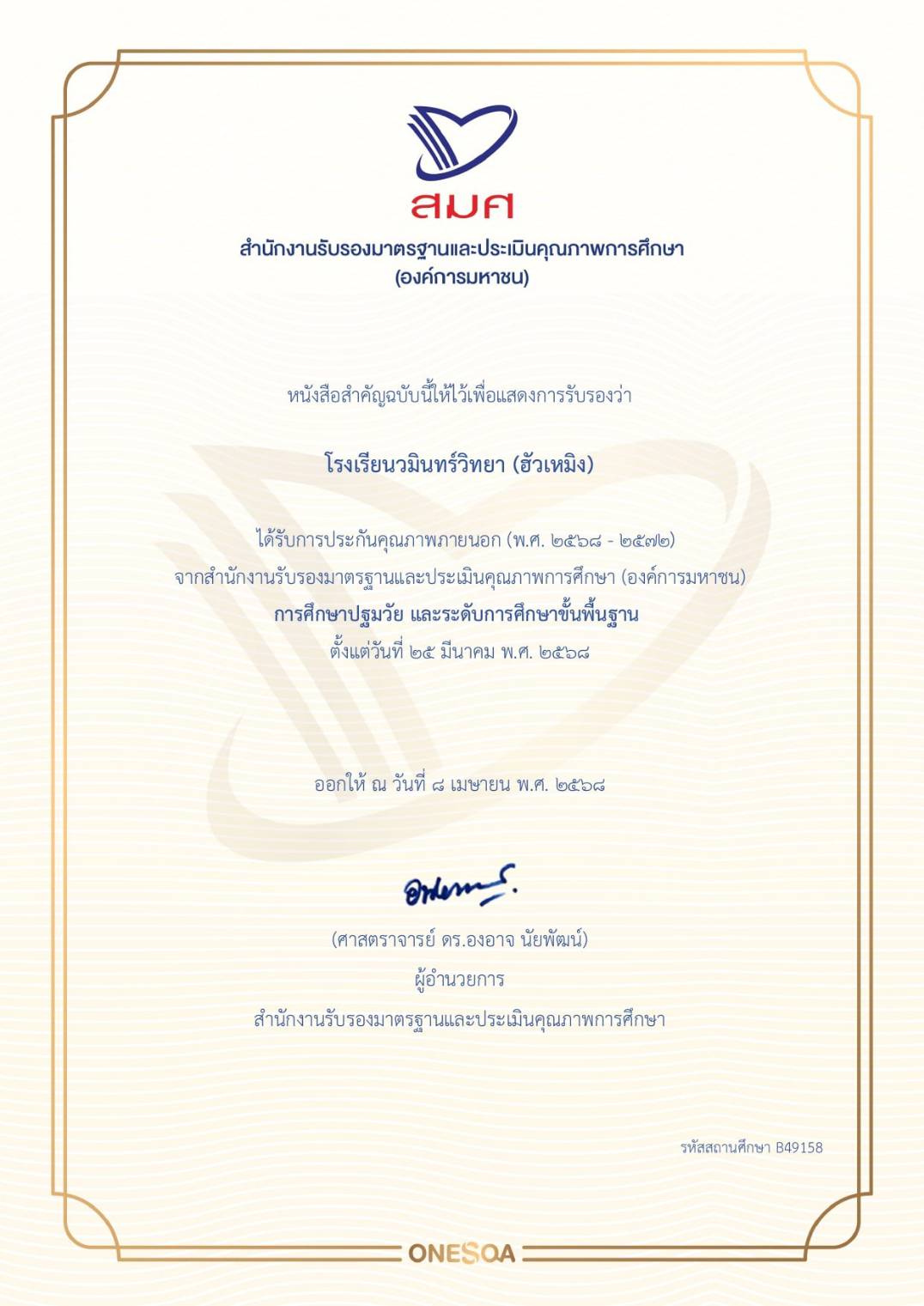 สำนักงานรับรองมาตรฐานและประเมินคุณภาพการศึกษา (องค์การมหาชน) ได้ให้หนังสือรับรองว่า โรงเรียนวมินทร์วิทยา (ฮัวเหมิง) ได้รับการประกันคุณภาพภายนอก (พ.ศ. ๒๕๖๘-๒๕๗๒) การศึกษาปฐมวัย และระดับการศึกษาขั้นพื้นฐาน