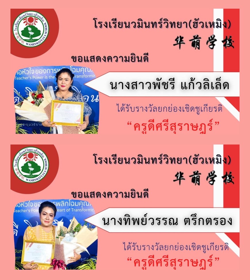 โรงเรียนวมินทร์วิทยา (ฮัวเหมิง) ขอแสดงความยินดี.. กับคุณครูที่ได้ รางวัล ”ครูดีศรีสุราษฎร์” เนื่องในโอกาส วันครู ครั้งที่ 67 ประจำปี 2566