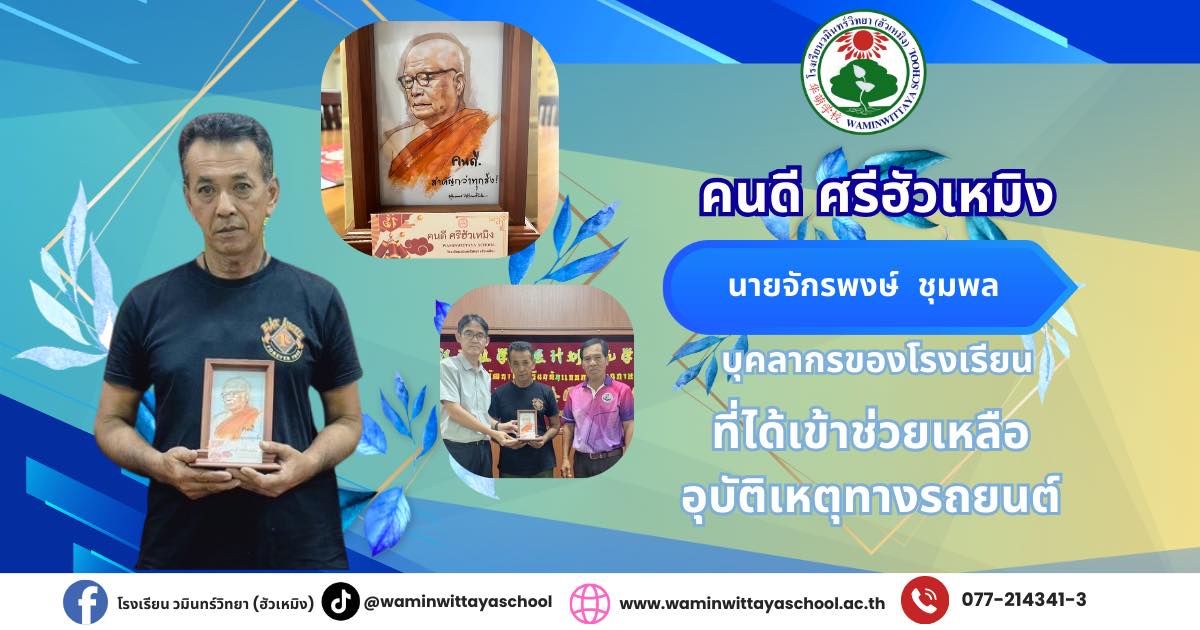 #คนดีศรีฮัวเหมิง นายจักรพงษ์ ชุมพล บุคลากรของโรงเรียน วมินทร์วิทยา(ฮัวเหมิง) ที่ได้เข้าช่วยเหลืออุบัติเหตุทางรถยนต์ โรงเรียน วมินทร์วิทยา(ฮัวเหมิง) ขอชื่นชมความดีในครั้งนี้ และขอให้นายจักรพงษ์ ชุมพล รักษาความดีและเป็นแบบอย่างที่ดีแบบนี้สืบไป