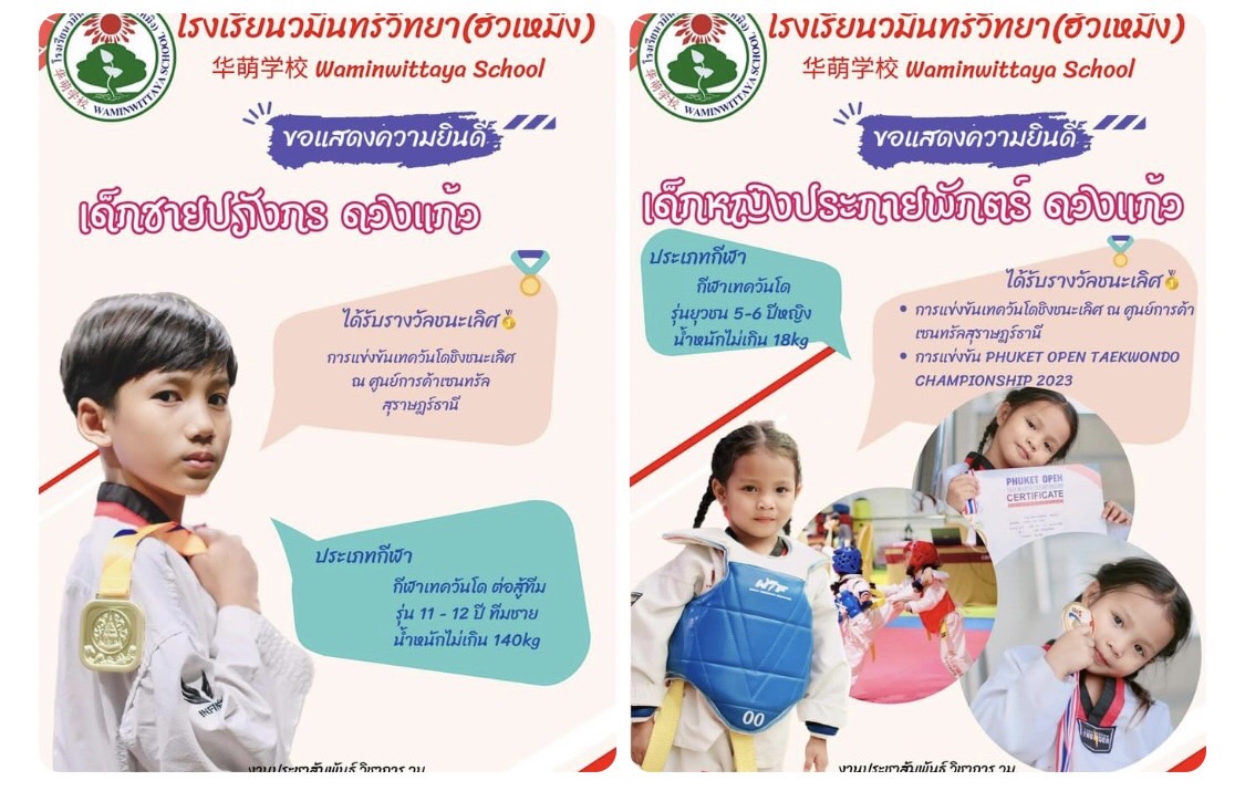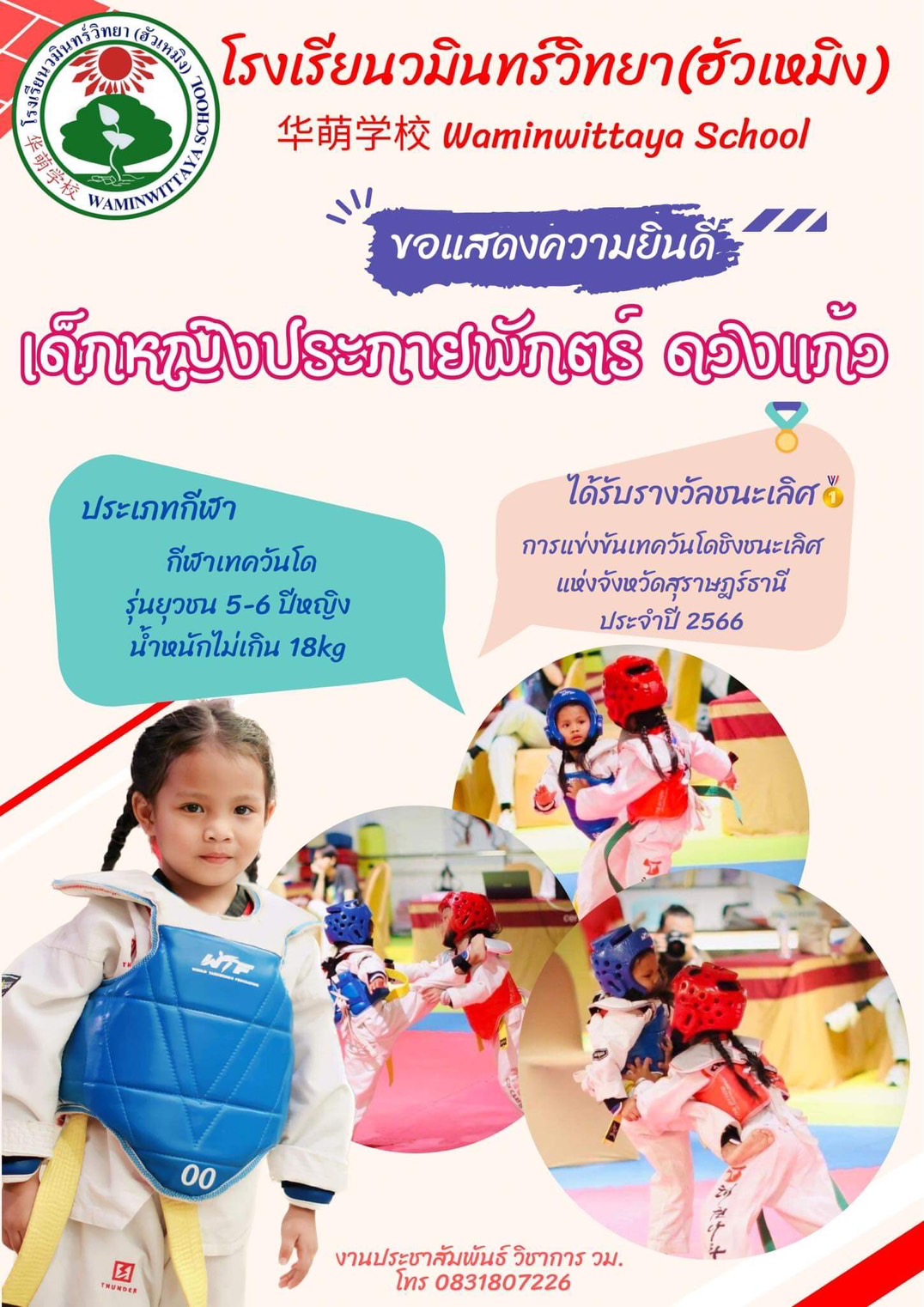 โรงเรียนวมินทร์วิทยา(ฮัวเหมิง) ขอแสดงความยินดี กับนักกีฬา เทควันโด คนเก่ง พี่วินวิน น้องหวานหวาน ที่สามารถคว้า เหรียญทอง พร้อม ถ้วยรางวัลนักกีฬายอดเยี่ยม มาได้ทั้ง 2 คนพี่น้องเลยค่ะ ——-
