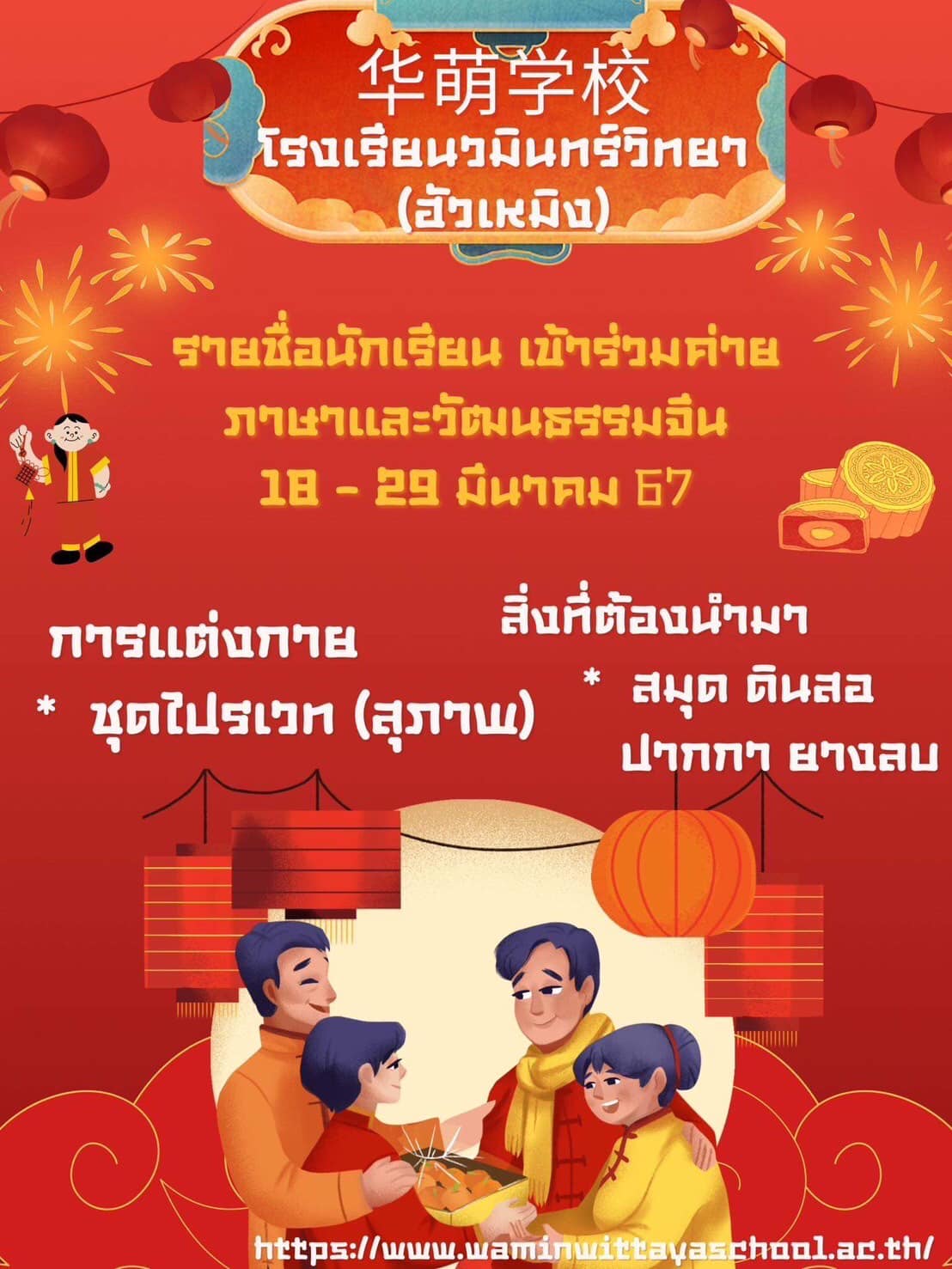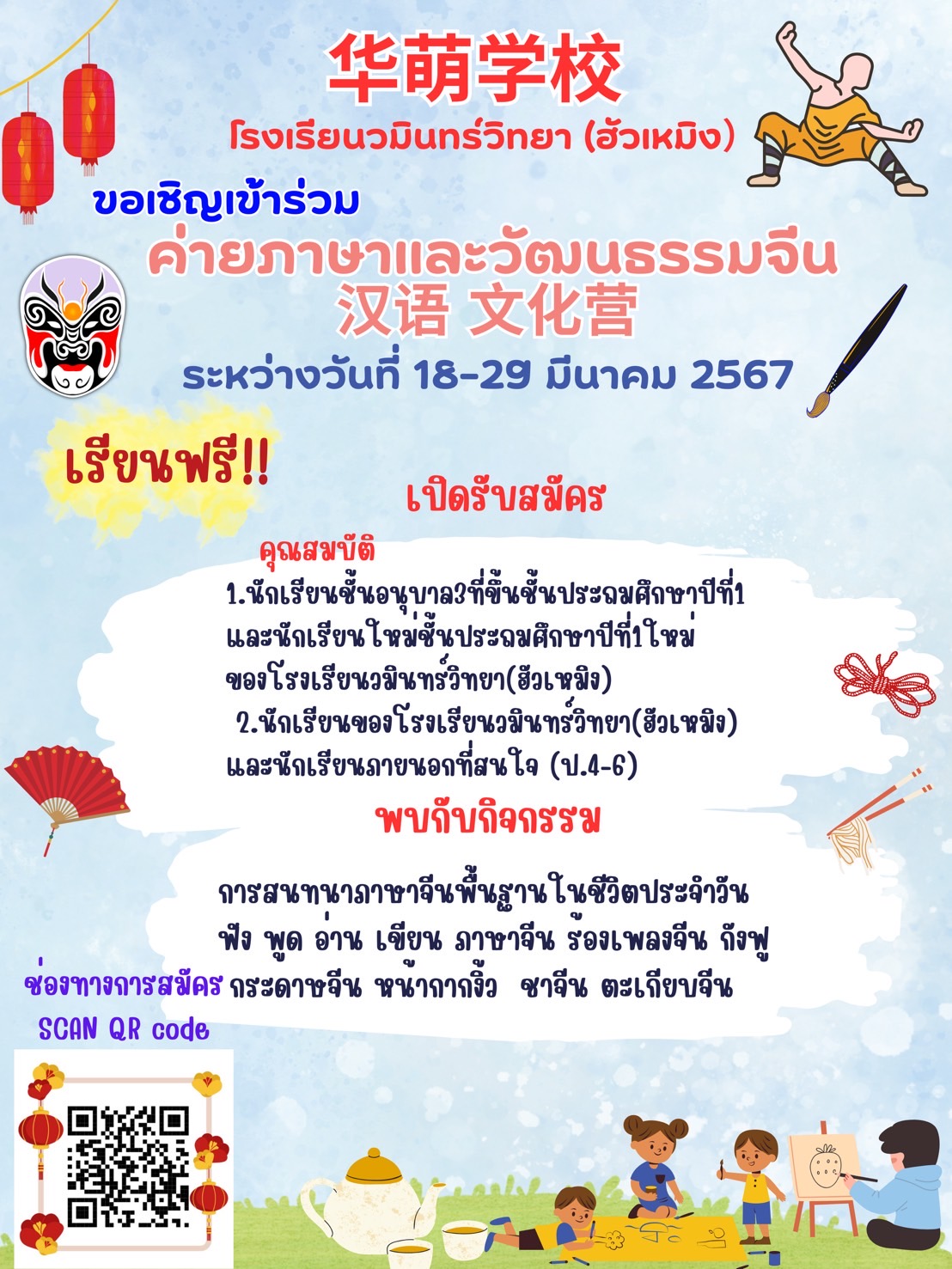ประชาสัมพันธ์ ค่ายภาษาและวัฒนธรรมจีน ระหว่างวันที่ 18-29 มีนาคม 2567 ณ โรงเรียนวมินทร์วิทยา (ฮัวเหมิง