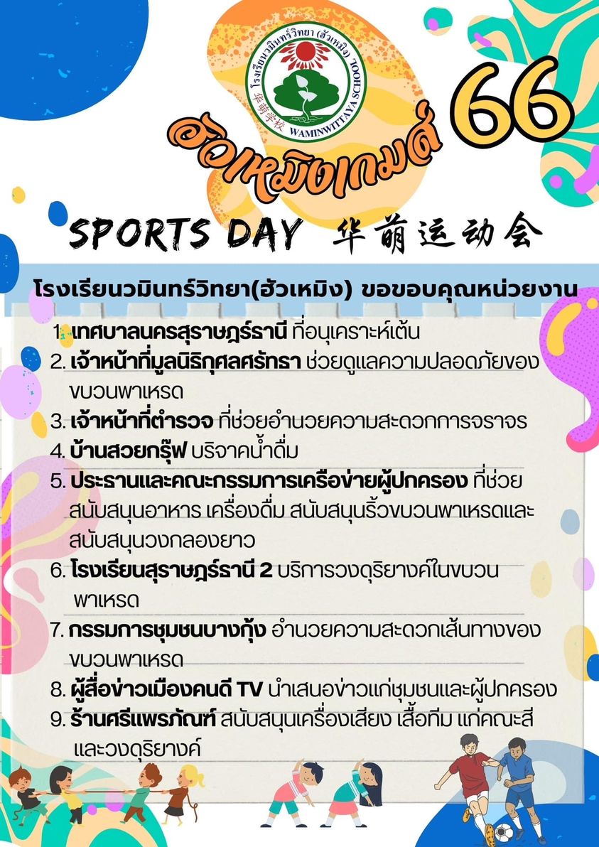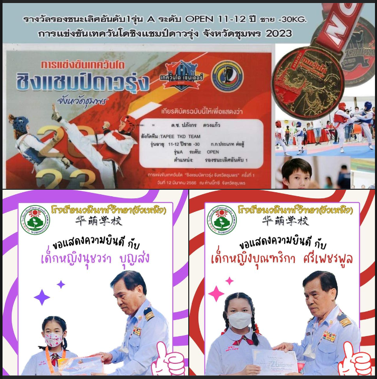 โรงเรียนวมินทร์วิทยา (ฮัวเหมิง) ร่วมส่งกำลังใจเชียร์ น้องปาร์ตี้ ด.ช. เขตโสภณ ภู่จันทึก ผ่านการคัดตัวการแข่งขันเทควันโดรอบคัดเลือกตัวแทนจังหวัดสุราษฎร์ธานีไปแข่งขันรอบคัดภาค 4 ในกีฬาเยาวชนแห่งชาติครั้งที่ 38 ณ จังหวัดนครศรีธรรมราชประเภทคาเด็ทรุ่น 12-14 ป