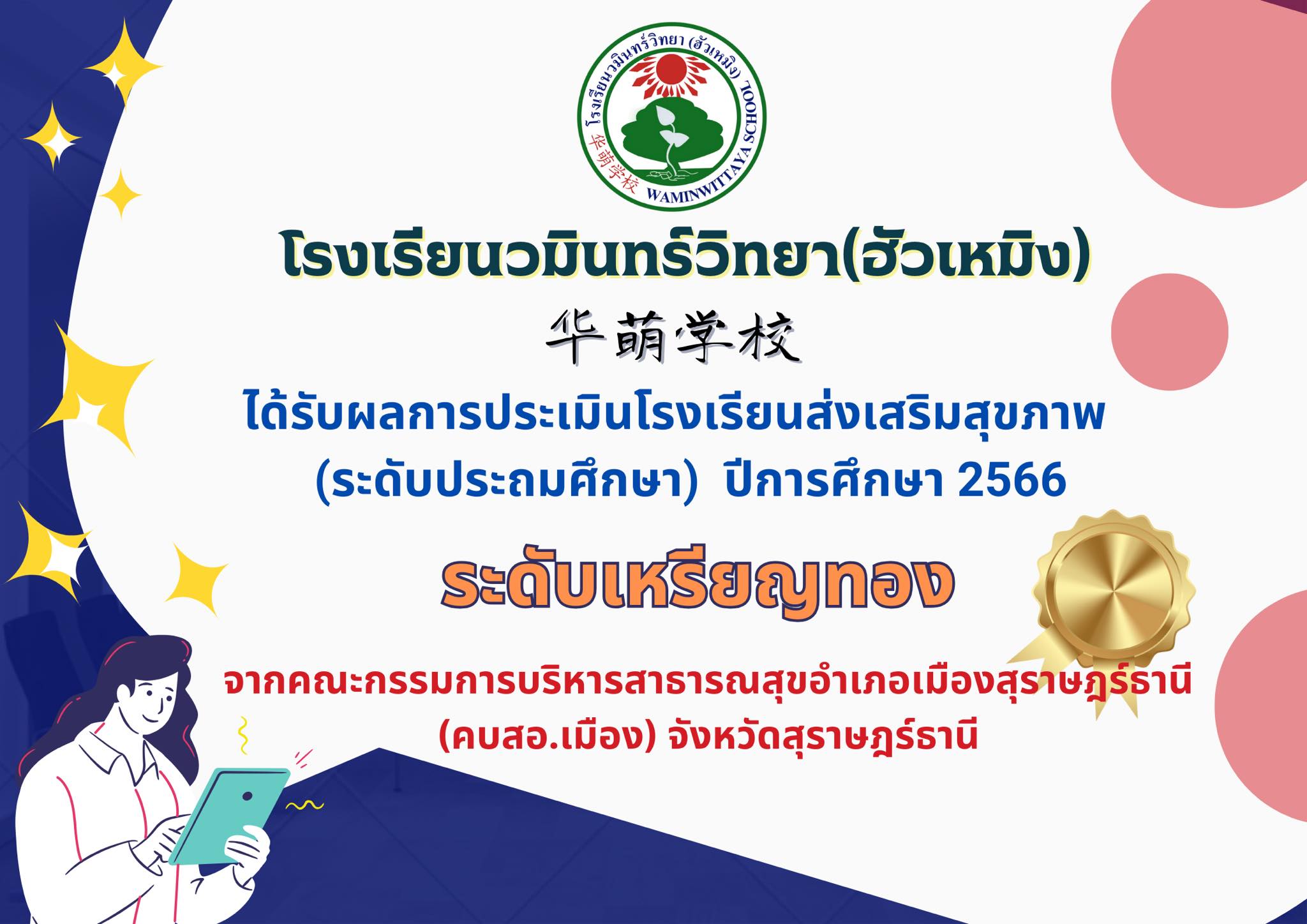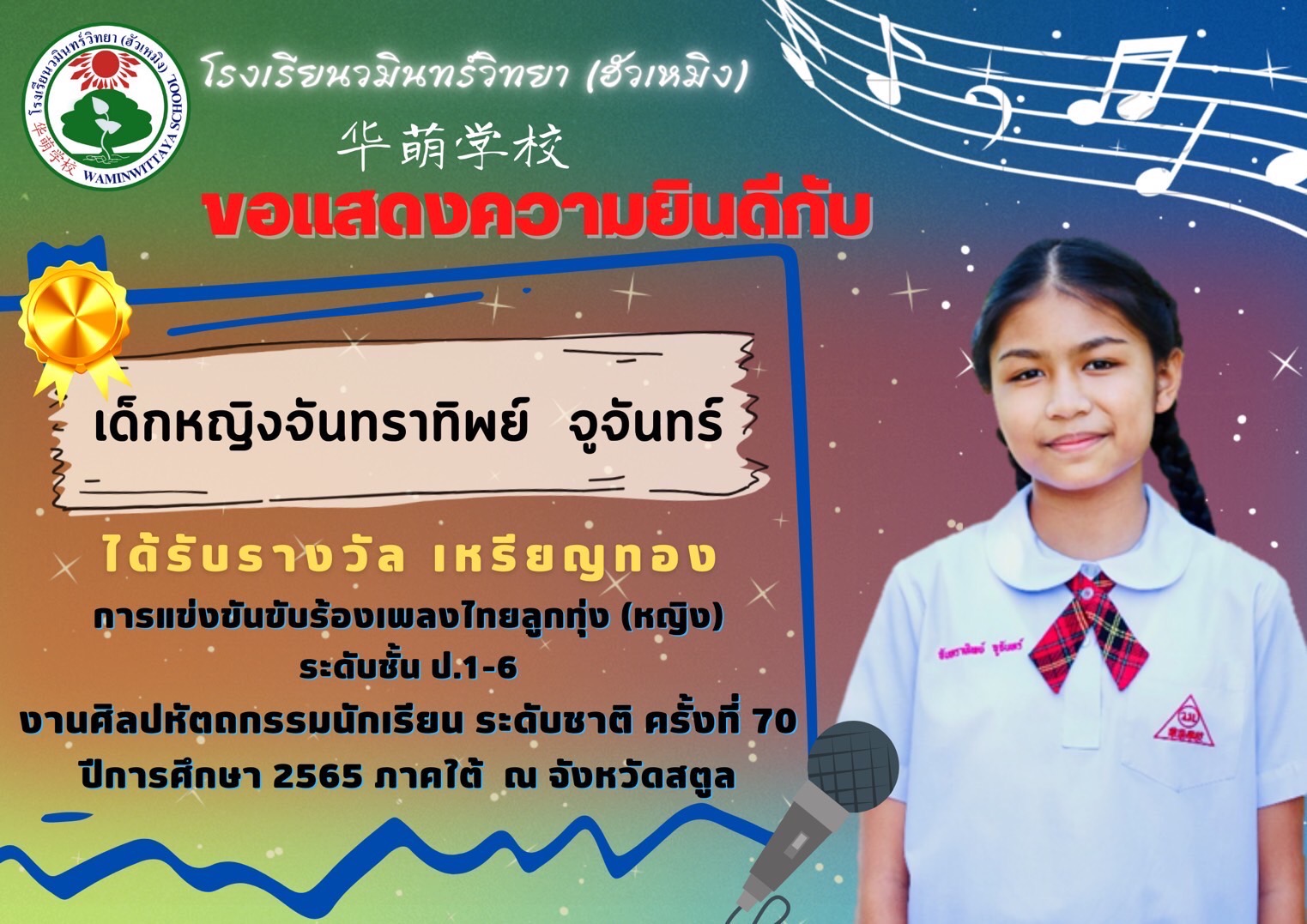 โรงเรียนวมินทร์วิทยา (ฮัวเหมิง) ขอแสดงความยินดี กับเด็กหญิงจันทราทิพย์ จูจันทร์ ได้รับรางวัลเหรียญทอง จากการแข่งขันร้องเพลงไทยลูกทุ่ง (หญิง) ระดับชั้น ป.1-6 งานศิลปหัตถกรรมนักเรียน ระดับชาติ ครั้งที่ 70 ปีการศึกษา 2565 ภาคใต้ ณ จังหวัดสตูล