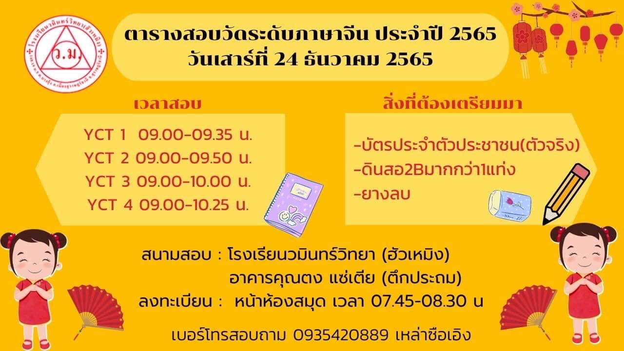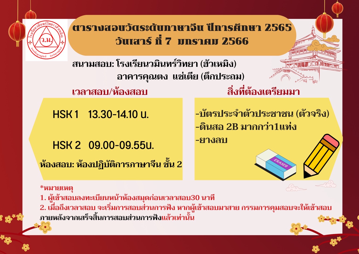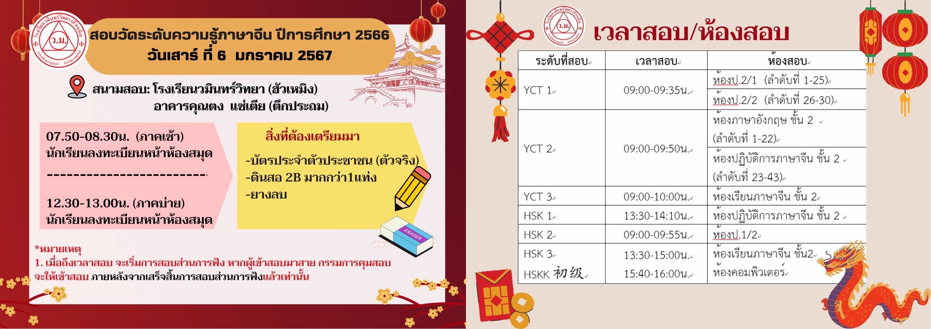 ประชาสัมพันธ์เกี่ยวกับการสอบวัดความรู้ภาษาจีน ปีการศึกษา 2566 วันที่ 6 มกราคม 2567 ณ โรงเรียนวมินทร์วิทยา (ฮัวเหมิง)