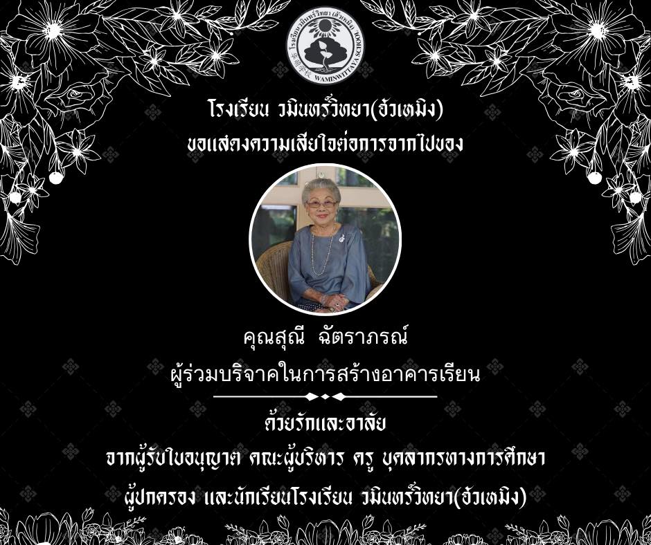 โรงเรียน วมินทร์วิทยา(ฮัวเหมิง) ขอแสดงความเสียใจต่อการจากไปของ คุณสุณี ฉัตราภรณ์ ผู้ร่วมบริจาคในการสร้างอาคารเรียน ด้วยรักและอาลัย จากผู้รับใบอนุญาต คณะผู้บริหาร ครู บุคลากรทางการศึกษาและนักเรียนโรงเรียน วมินทร์วิทยา(ฮัวเหมิง)