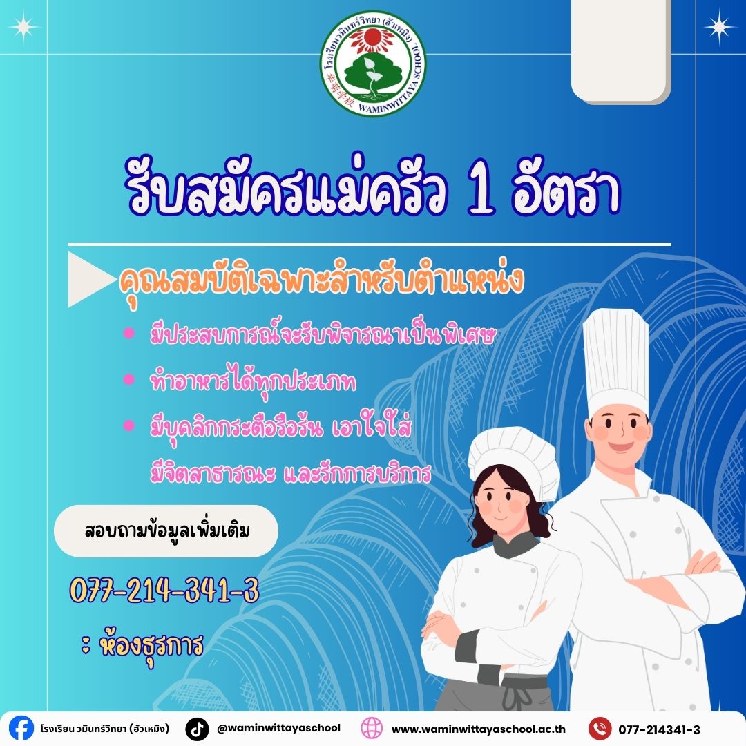 เปิดรับสมัครแม่ครัว 1 อัตรา เปิดรับสมัครทุกวัน สามารถติดตามรายละเอียดด้านล่างได้เลยครับ/ค่ะ..