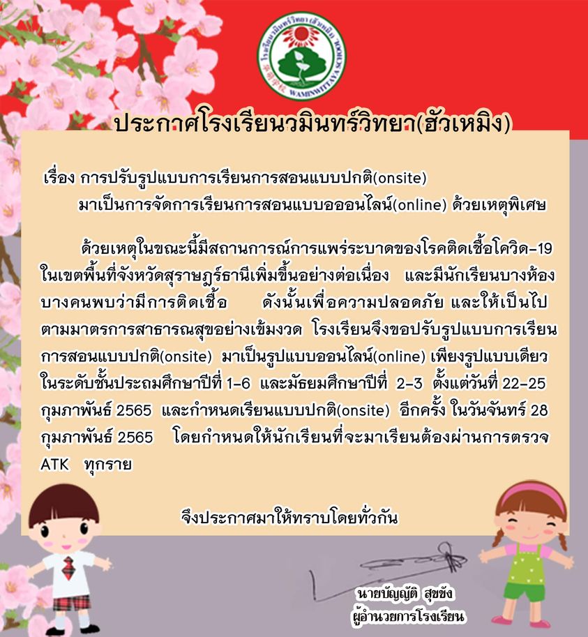 ประกาศโรงเรียนวมินทร์วิทยา(ฮัวเหมิง) ปรับรูปแบบการเรียนการสอนแบบปกติ (Onsite) มาเป็นการจัดการเรียนการสอนแบบออนไลน์ (Online)เพียงรูปแบบเดียว ในระดับชั้น ประถม-มัธยม 22-25 กุมภาพันธ์ 2565