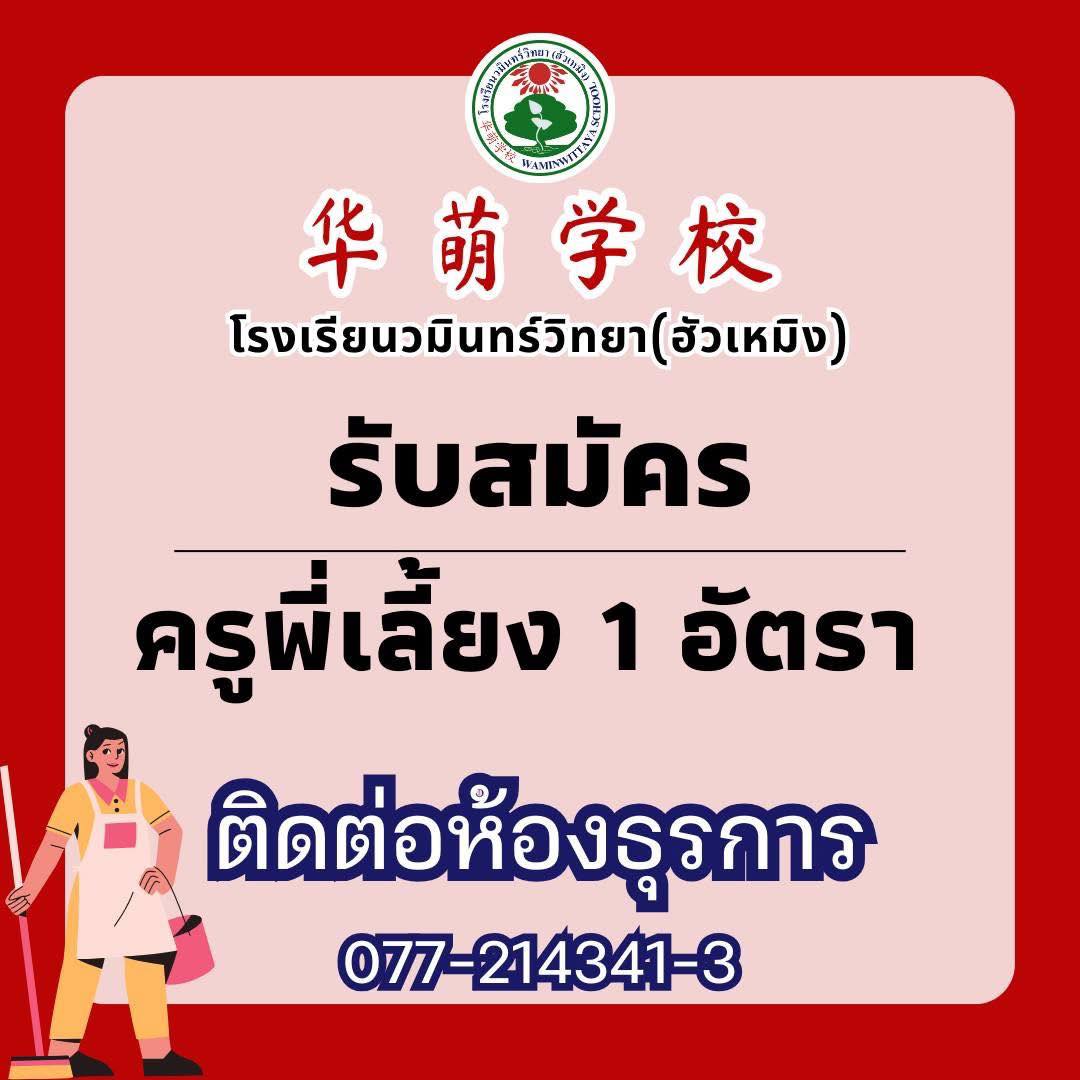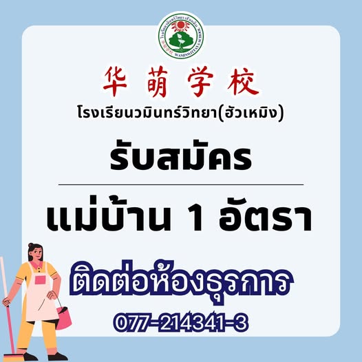 โรงเรียนวมินทร์วิทยา (ฮัวเหมิง) ประกาศรับสมัครแม่บ้าน 1 อัตรา