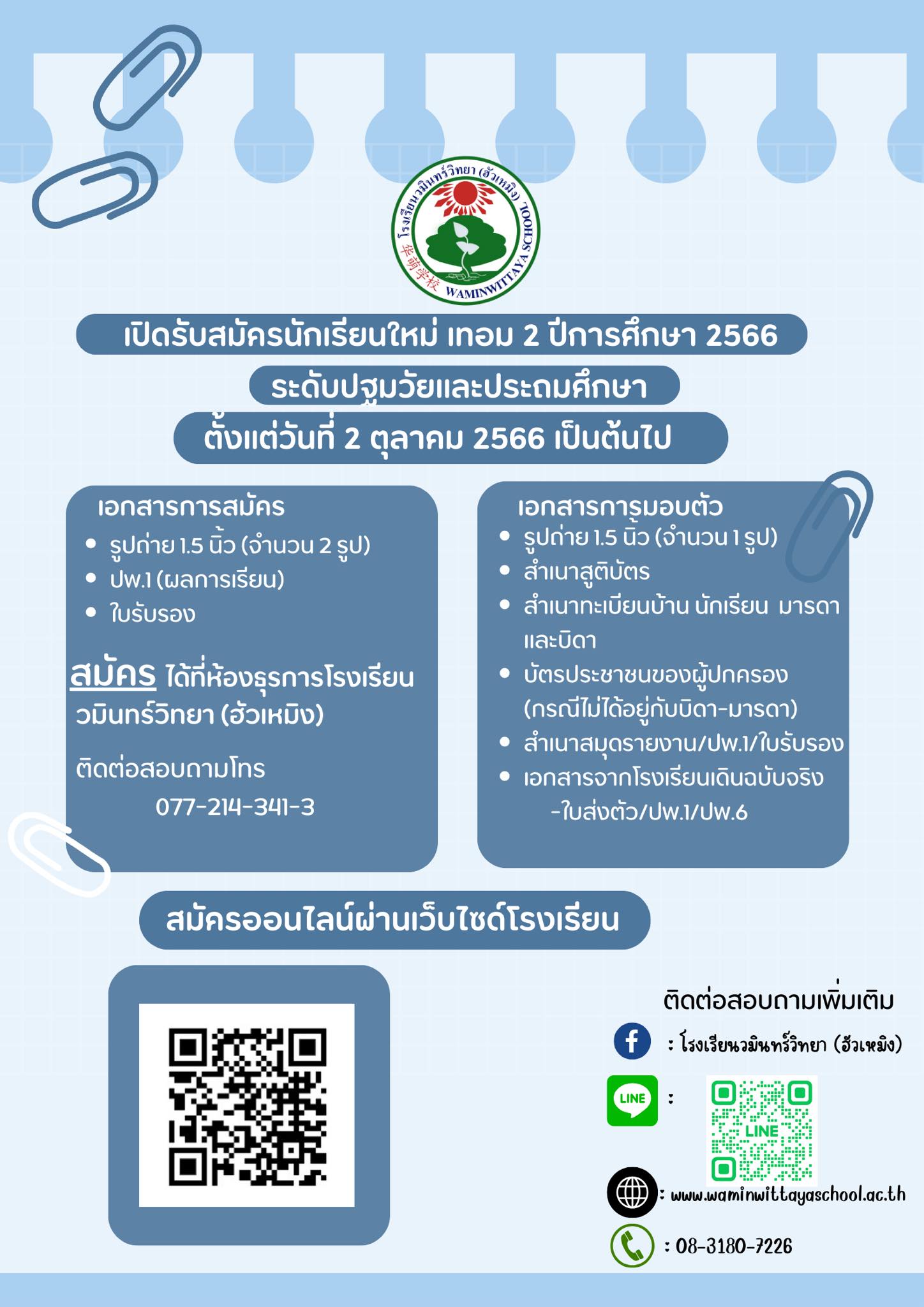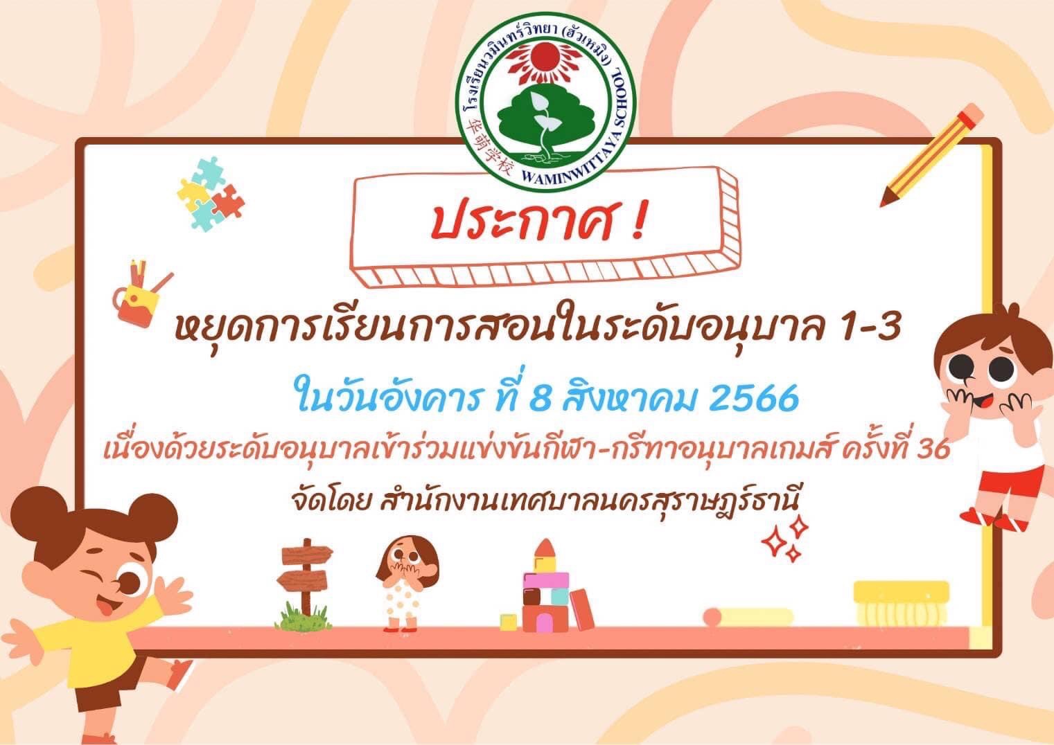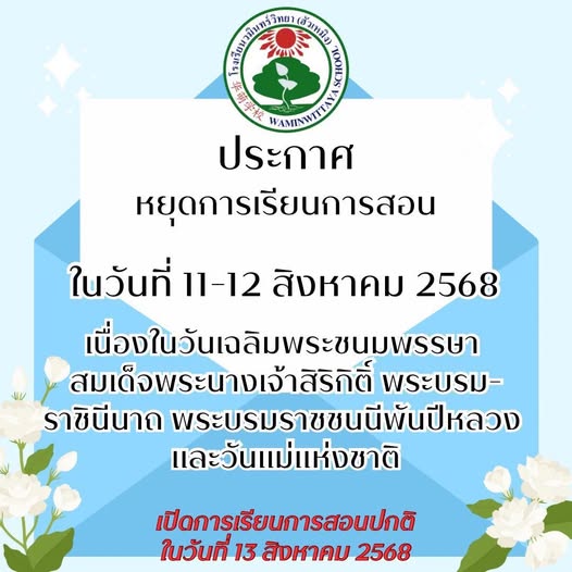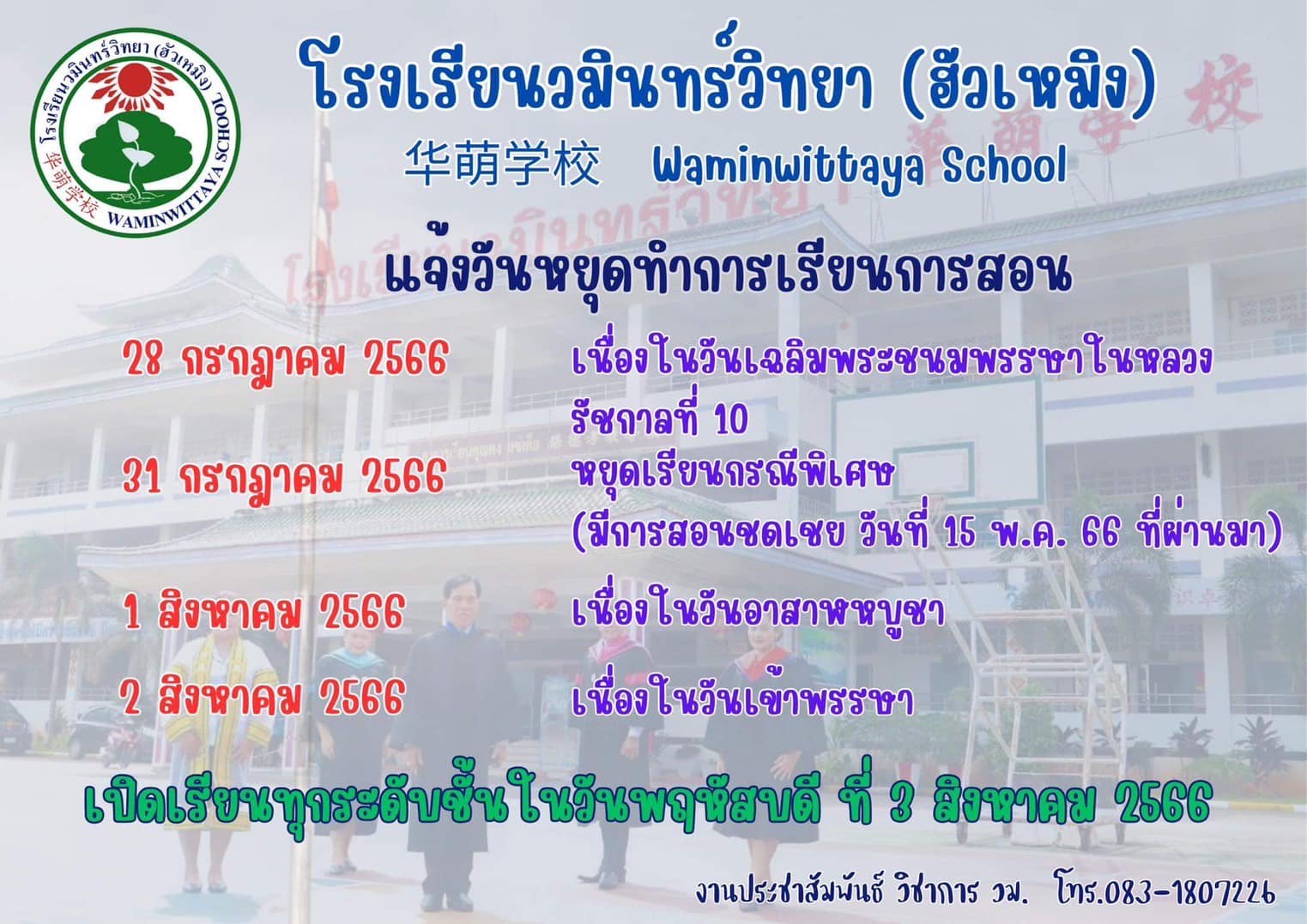 โรงเรียนวมินทร์วิทยา (ฮัวเหมิง) ขอประกาศหยุดทำการเรียนการสอน ตั้งแต่วันที่ 28 กรกฎาคม 2566 - 2 สิงหาคม 2566 เนื่องในวันสำคัญต่างๆ