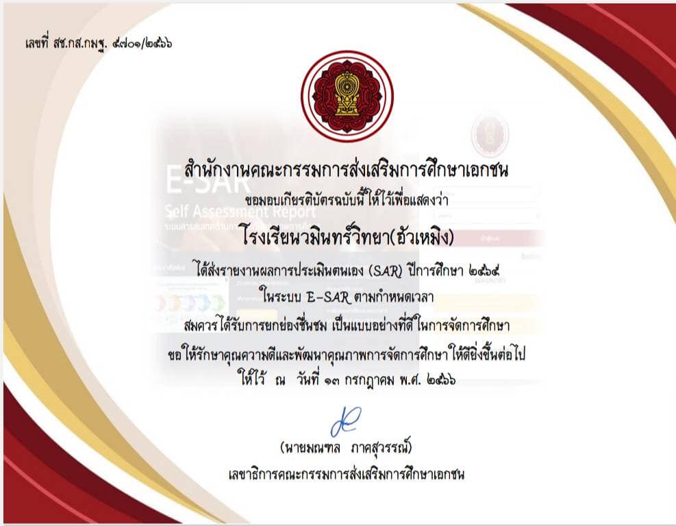 โรงเรียนวมินทร์วิทยา(ฮัวเหมิง) ได้รับเกียรติบัตรผลการประเมินตนเอง SAR ปีการศึกษา 2565 ในระบบ E-SAR ตามเวลาที่กำหนด