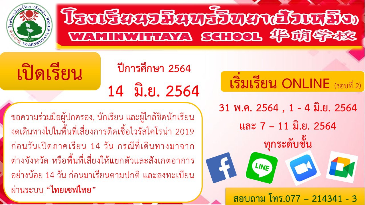 โรงเรียนวมินทร์วิทยา (ฮัวเหมิง) จัดการเรียนการสอนออนไลน์ ในวันที่ 31 พ.ค. 2564 , 1-4 มิ.ย. 2565 ทุกระดับชั้น โดยกำหนดการเปิดภาคเรียนในวันที่ 14 มิ.ย. 2564