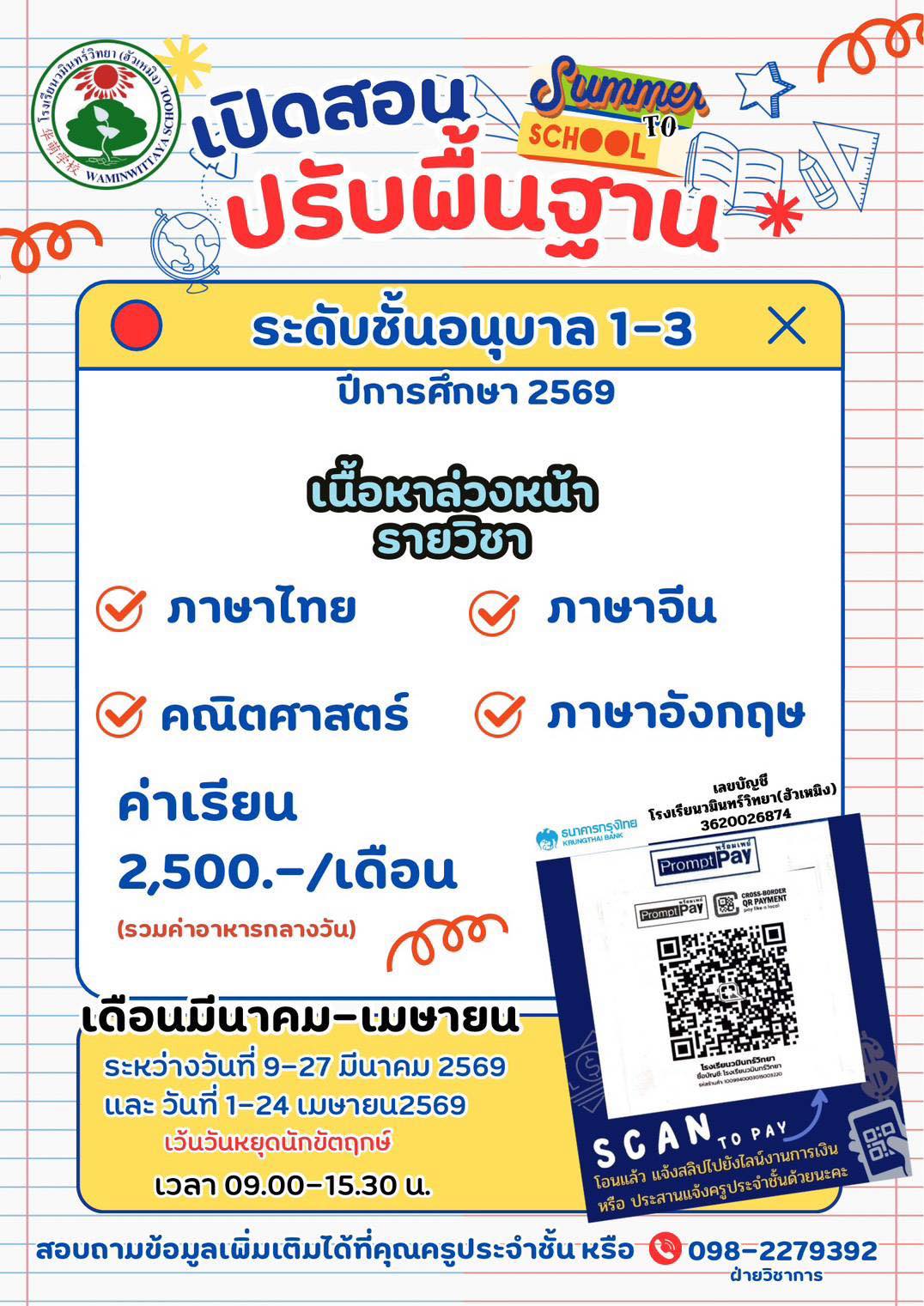 ติดต่อสอบถาม… สนใจสมัครได้ที่ห้องธุรการ โรงเรียนวมินทร์วิทยา (ฮัวเหมิง)