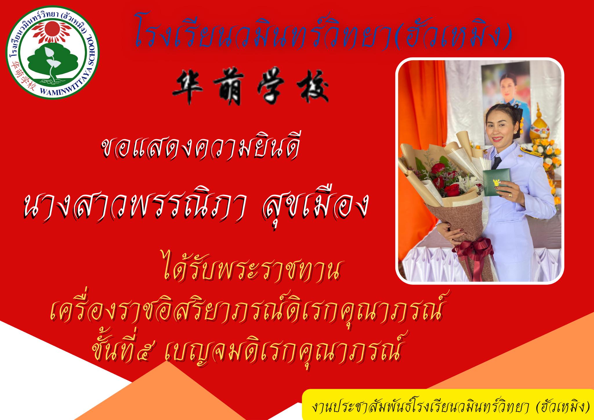โรงเรียนวมินทร์วิทยา (ฮัวเหมิง) ขอแสดงความยินดี กับคุณครูพรรณิภา สุขเมือง (ครูแยม) ได้รับพระราชทานเครื่องราชอิสริยาภรณ์ดิเรกคุณาภรณ์ชั้นที่ ๕ เบญจมดิเรกคุณาภรณ์