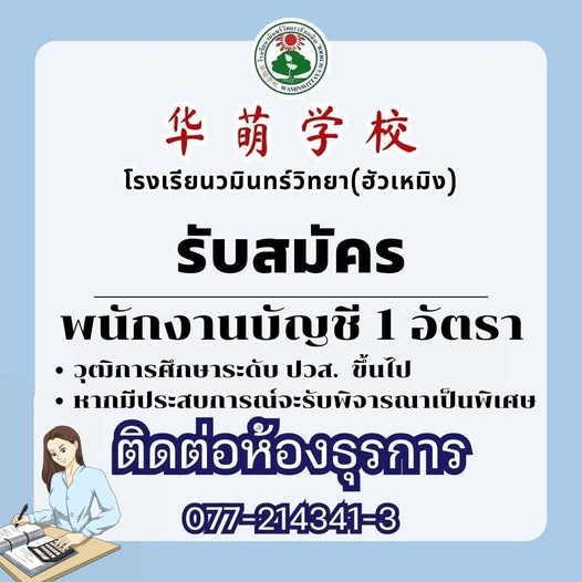 โรงเรียนวมินทร์วิทยา (ฮัวเหมิง) ประกาศรับสมัครพนักงานบัญชี 1 อัตรา