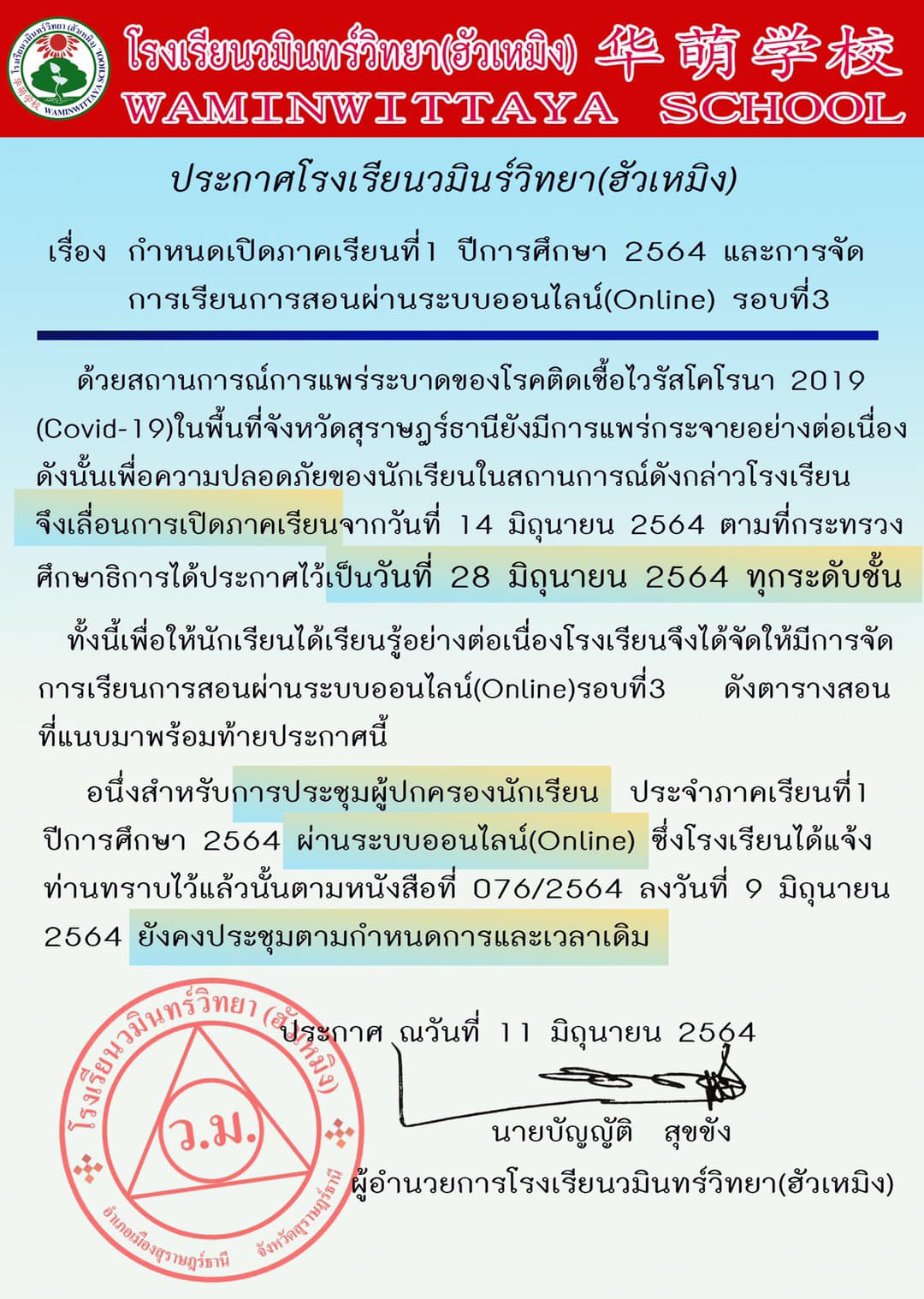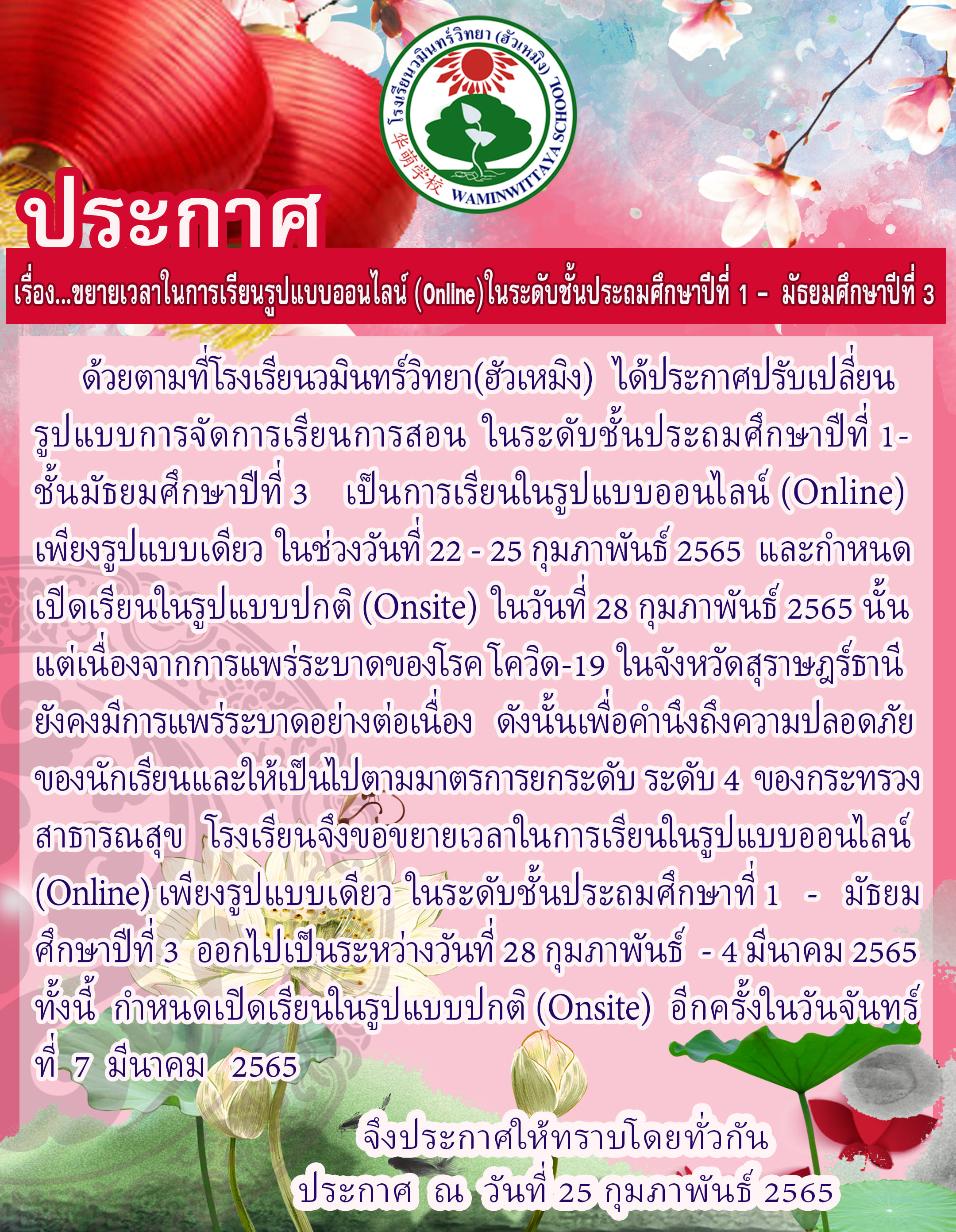 ประกาศจากทางโรงเรียนวมินทร์วิทยา (ฮัวเหมิง) เรื่อง การขยายเวลาในการเรียนรูปแบบออนไลน์ (Online) ในระดับชั้น ป.1 - ม.3 ประกาศ ณ วันที่ 25 กุมภาพันธ์ 2565