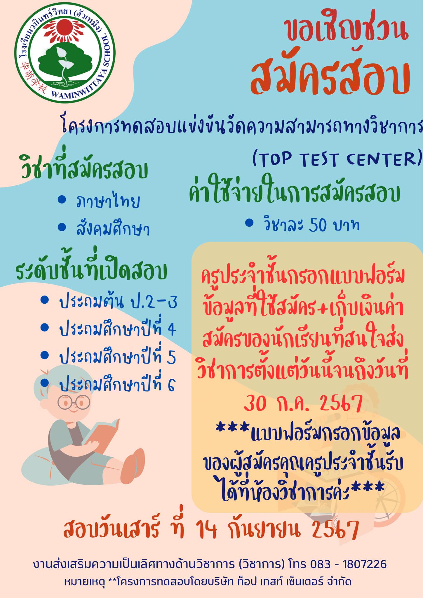 การทดสอบวัดความรู้ บริษัท TOP TEST ประจำปีการศึกษา 2567 ภาคเรียนที่ 1 #สนใจสมัครสอบ ติดต่อครูประจำชั้น ได้เลยจ้า