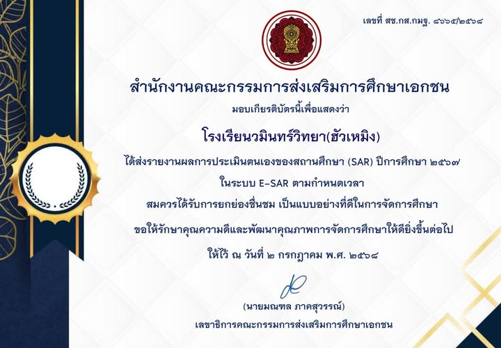 โรงเรียน วมินทร์วิทยา(ฮัวเหมิง) ได้รับเกียรติบัตร โรงเรียนที่ส่งรายงานผลการประเมินตนเองของสถานศึกษา (SAR) ปีการศึกษา ๒๕๖๗ ผ่านระบบสารสนเทศด้านการประกันคุณภาพการศึกษา (E-SAR) ตามกำหนดเวลา จากสำนักงานคณะกรรมการส่งเสริมการศึกษาเอกชน