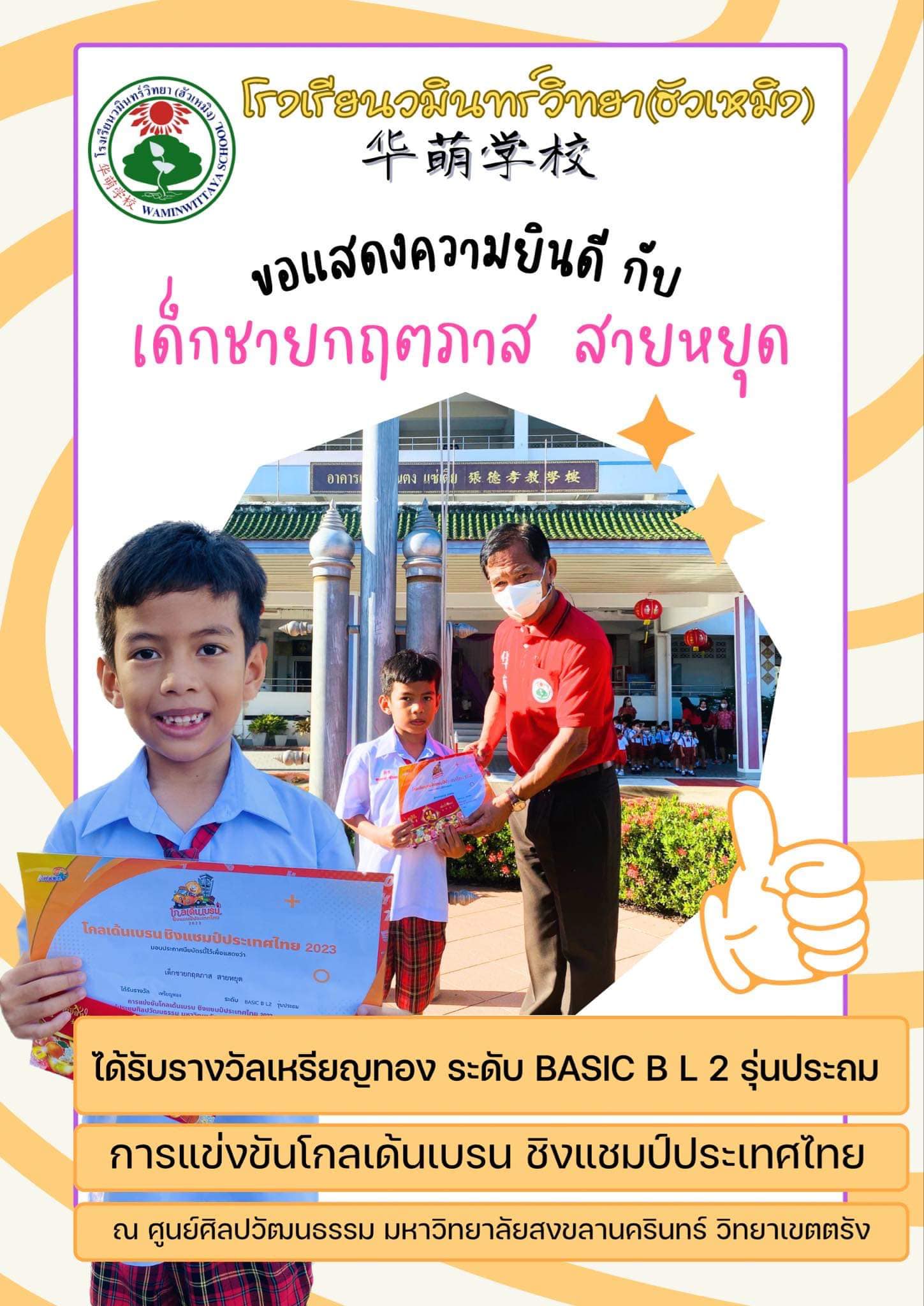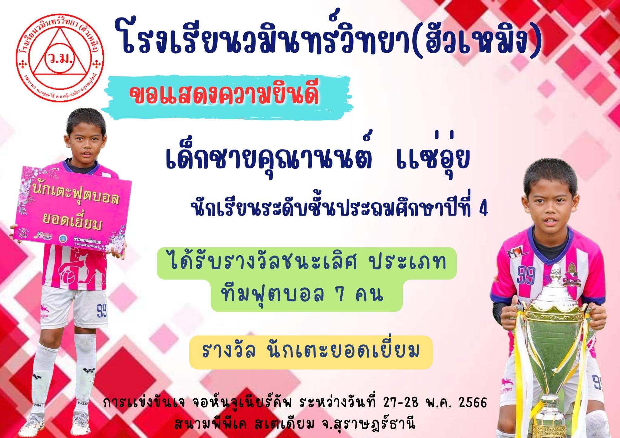 โรงเรียนวมินทร์วิทยา(ฮัวเหมิง) ขอแสดงความยินดีกับ เด็กชายคุณานนต์ เเซ่อุ่ย (น้องอาร์เซ) นักเรียนระดับชั้นประถมศึกษาปีที่ 4 ห้อง 2 จากการเเข่งขันเจ จอห์นจูเนียร์คัพ ระหว่างวันที่ 27-28 พ.ค. 2566 ณ สนามพีพีเค สเตเดียม จ.สุราษฎร์ธานี