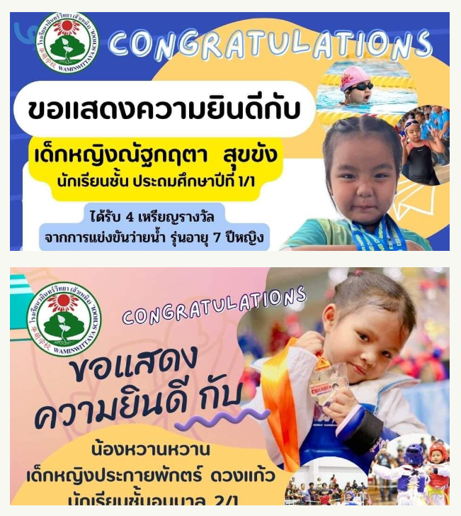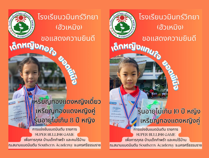 โรงเรียนวมินทร์วิทยา (ฮัวเหมิง) ขอแสดงความยินดี กับเด็กหญิงทอใจ ยอดพินิจ นักเรียนระดับชั้นประถมศึกษาปีที่ 2/1 และเด็กหญิงแทนใจ ยอดพินิจ นักเรียนระดับชั้นประถมศึกษาปีที่ 3/2