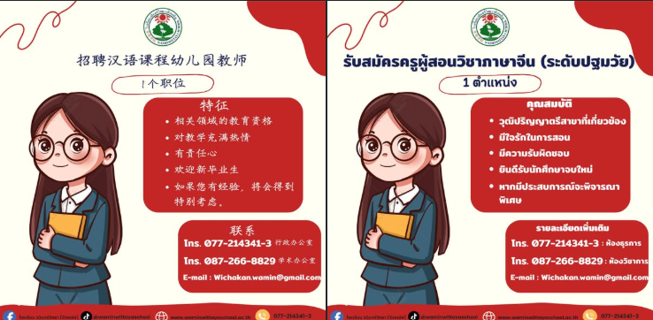 เปิดรับสมัครคุณครูภาษาจีน ระดับปฐมวัย สามารถติดตามรายละเอียดด้านล่างได้เลยครับ/ค่ะ..