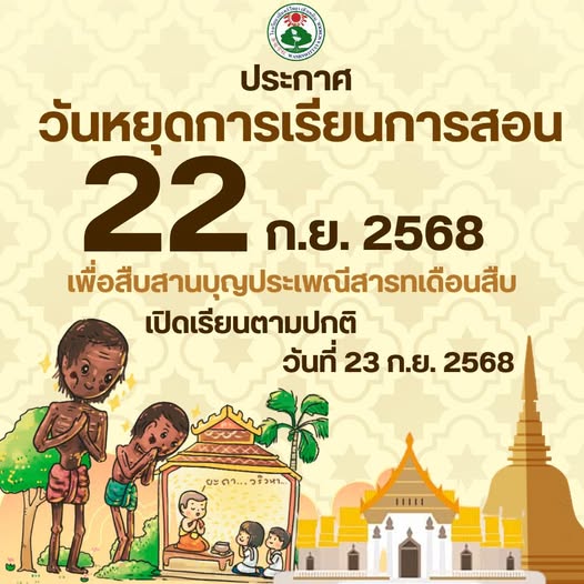 #ประกาศ #วันหยุดการเรียนการสอน 22 ก.ย. 2568 เพื่อสืบสานบุญประเพณีสารทเดือนสิบ เปิดเรียนตามปกติ วันที่ 23 ก.ย. 2568 #ขอบคุณครับ/ค่ะ